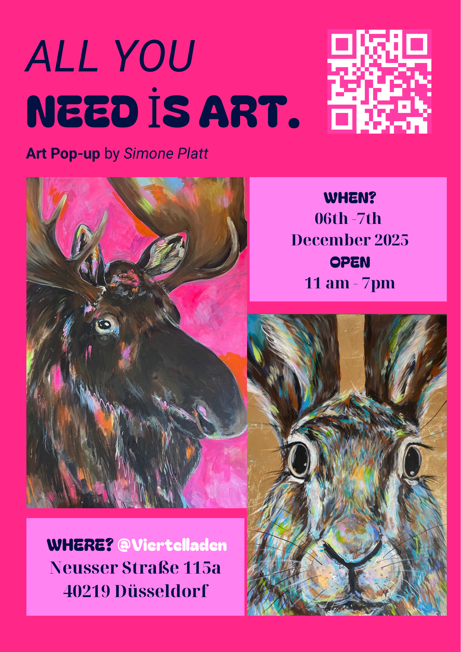 Zum 2. Advent zeigt Simone Platt im Viertelladen ein kompaktes Art Pop-up. Zu sehen sind neue, ausdrucksstarke Werke mit dem Fokus auf Tierportraits aber auch abstrakten Bildern. Das Pop-up ist an beiden Tagen von 11:00 – 19:00 Uhr geöffnet und die Künstlerin freut sich über Ihren Besuch bei weihnachtlicher Stimmung und Drinks.